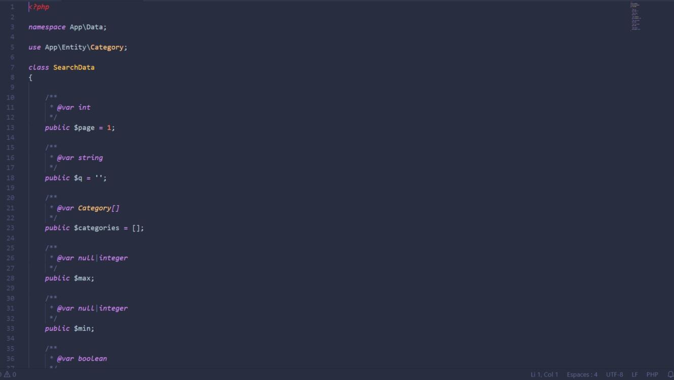 Le point clé de notre système est la conception du filtre qui va permettre à l'utilisateur de rechercher les produits. Pour créer ce système on va commencer par créer un objet qui va représenter les données de la recherche. Cet objet sera un simple objet PHP qui aura comme propriété les différentes options de recherche.
