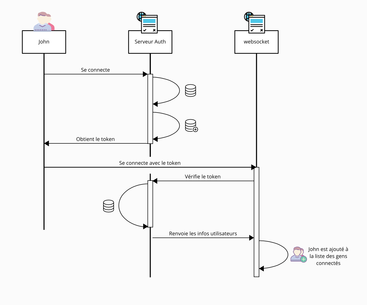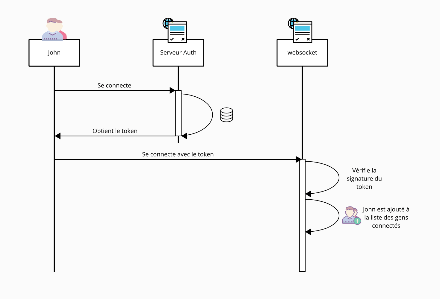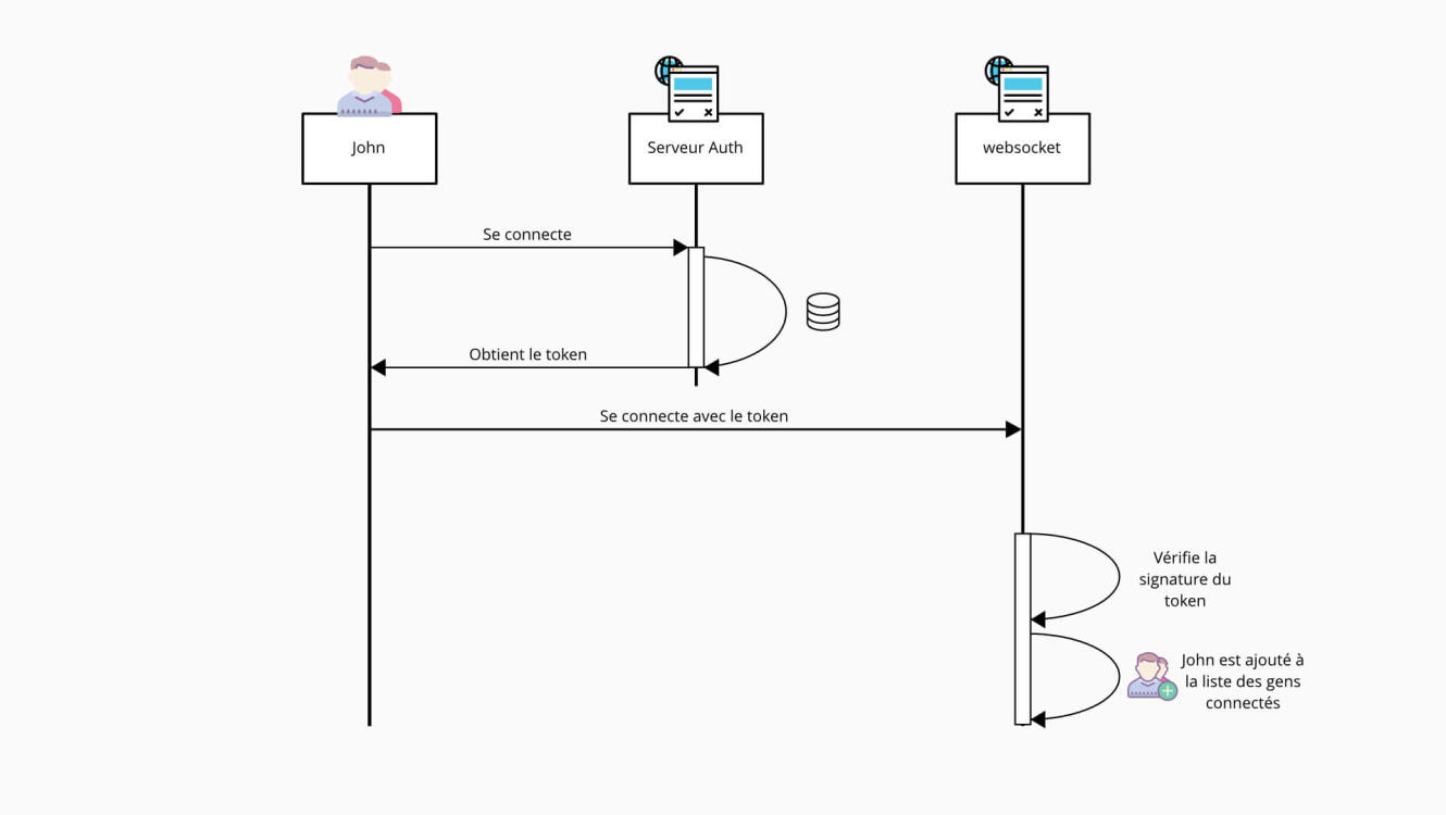 Lorsqu'un utilisateur se connecte à notre application, on génère et on associe un token à la session. Ce token sera utilisé par les autres composants de notre application et devra être vérifié par le serveur qui l'a généré. Par exemple, si le serveur de websocket a besoin de récupérer des informations utilisateur, il devra interroger le serveur d'authentification pour obtenir les informations associées au token reçu. Cette architecture présente donc comme principale faiblesse de centraliser la partie vérification sur le serveur d'authentification, ce qui peut poser des problèmes en terme de charge / performance.